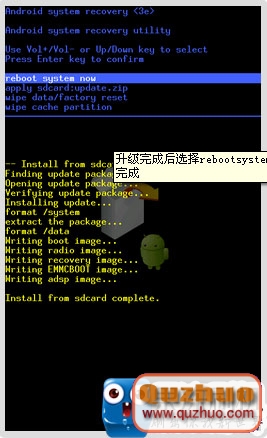 第四步,升級完成後提示“install from sdcard complete”,選擇reboot system now,確定重啟機器,升級完成~~~