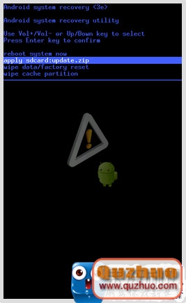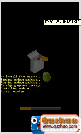 第三步,按方向上下選擇apply sdcard:update.zip,再按Enter進行升級,屏幕出現升級進度條