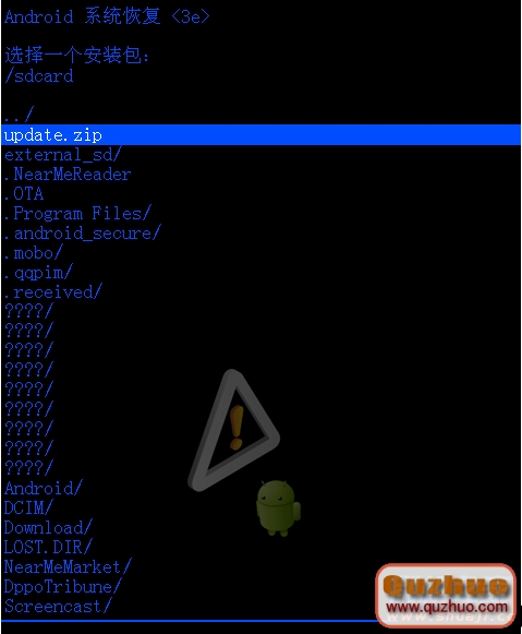 3:然後用音量加減鍵控制選項,選中“手動選擇update.zip安裝更新”,然後按電源鍵進入。