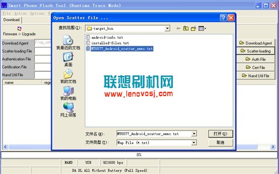 4,然後點擊軟件上的Scatter-loading按鈕選擇軟件對應的文件。 在target_bin文件夾中選擇MT6577_Android_scatter_emmc.txt,如下: