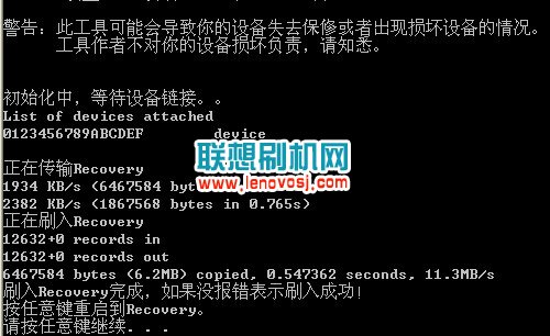 3、如下圖,手機連接電腦後,如果此時驅動安裝正常的話,一鍵刷入工具會自動刷寫recovery進去,如下圖:如果工具沒自動刷入或者卡住了,請下載這個聯想手機驅動>>>>>>>>>>安裝即可