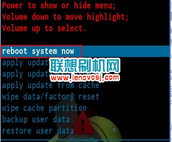 2、關機後,按住音量上、下鍵的同時按住開機鍵三鍵不放進入recovery 模式。 緊接著按電源鍵可顯示菜單,如下: