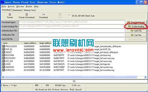 1:解壓線刷包,然後解壓工具並運行其中的flash_tools.exe,點擊Scatter-loading按鈕選擇軟件對應的文件: