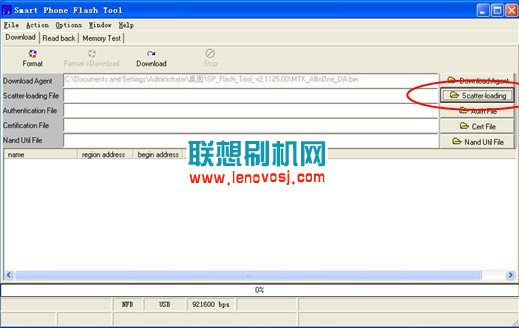 4、如下圖,單擊Scatter-loading,選擇剛才解壓的固件包,選擇MT6573_Android_acatter.txt確定,如下圖: