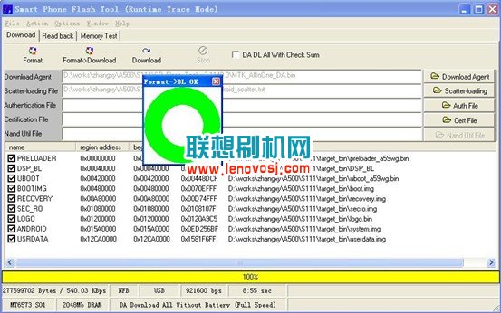 4、拔掉電池不裝,按住“音量+”不放,插入USB線,自動開始下載。先出現紅色進度條後,接著出現黃色進度條,進度條全部走完後,會出現下圖OK字樣的提示,代表聯想A360線刷刷機教程結束: