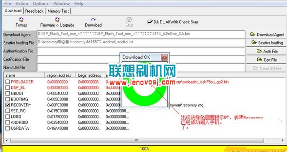 4、等進度條到100%,並出現綠色圖標,表示刷入recovery完成,成功後會提示綠色的圈圈,如下圖所示 :