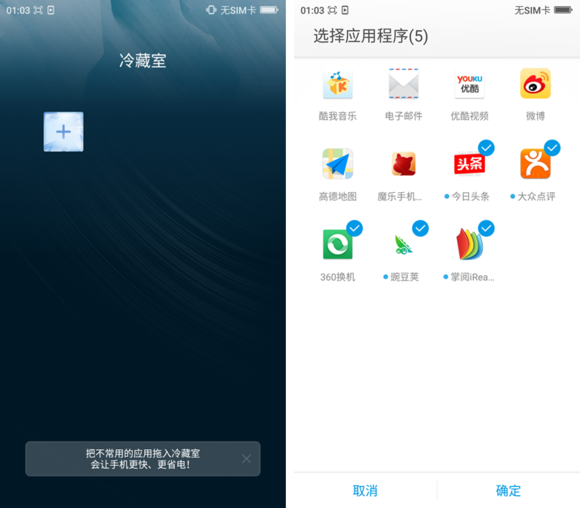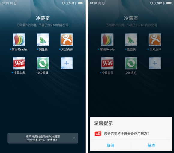 還有個冷藏室應用,把不常用的應用拖動到這個文件夾,可達到“冷藏”效果,或是可以進入冷藏室中,選擇不常用的應用進行冷藏,既能避免這些應用在後台偷偷占內存,又能達到省電效果。同時也能隨時從冷藏室解凍,動畫效果也是非常的貼心。