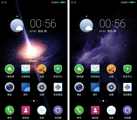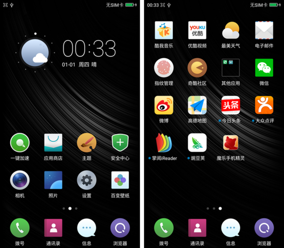 桌面圖標有圓形和方形,整體扁平,偏個性化。狀態欄細節,首頁有時鐘部件,所以狀態欄不再重復顯示時間,當滑動到其他頁面時,屏幕左上角的時間才會顯示。當然,滑動也是非常流暢,並未出現任何卡頓現象。