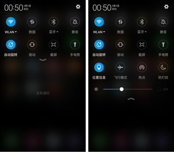 360 OS是基於安卓5.1系統進行深度優化的,下拉通知欄也保留了原生風格。個人特別喜歡的一點,就是wifi和藍牙的開關下方有下拉菜單,連接熱點和藍牙匹配都能在當前界面完成,十分方便。