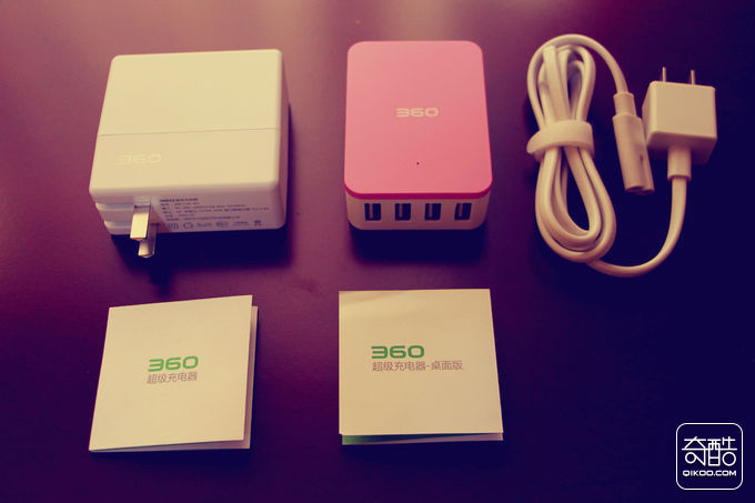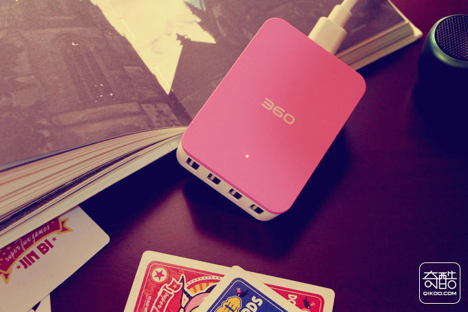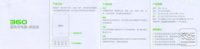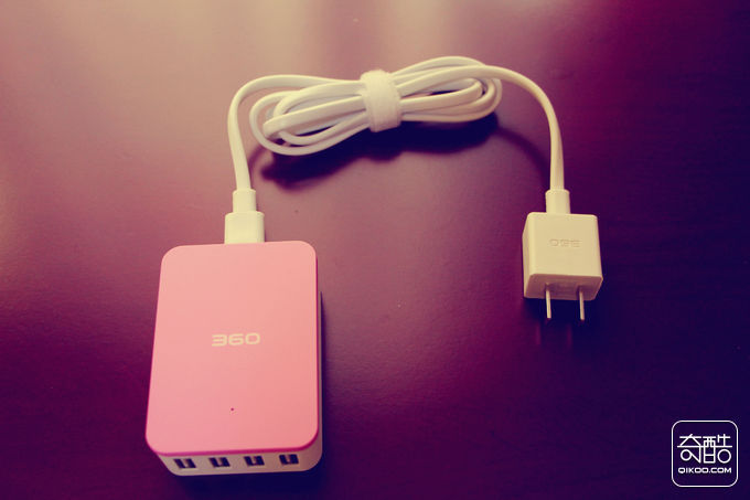 四個充電接口和桌面版一樣也沒有多余的標識,干淨利索很養眼。旅行版的充電頭分量一樣很足做工依舊沒得說,360硬件的做工質量一直在提升,並沒有因為是幾十塊錢的東西而偷工減料,這點很值得贊揚。