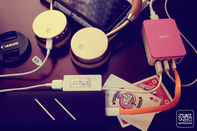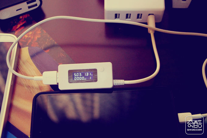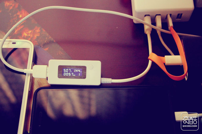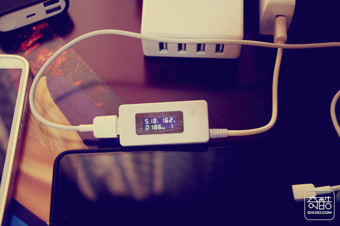 通過以上測試可以看到360超級充電器的充電效果基本上都能與原裝充電器一致,並且同樣的充電接口在充不同設備時確實也能智能調節電壓和電流的大小,這樣一來在充電速率和充電安全上都能有所保障。為了更進一步測試,下圖是三個接口同時工作的圖片。