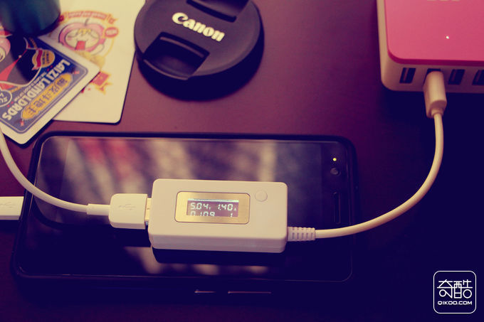 大家可以看到當我同時接入移動電源、6P、和耳機之後耳機端的電壓電流讀數依舊穩定在原來的數值上,更進一步說明360超級充電器在多個設備接入充電的時候,相互端口間完全沒有影響。其智能化安全化的特點再一次得到印證。