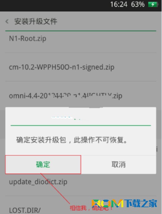 6:接下來選擇剛才復制到手機存儲卡根目錄下的zip格式的升級包,然後選擇確定,接著就開始安裝啦