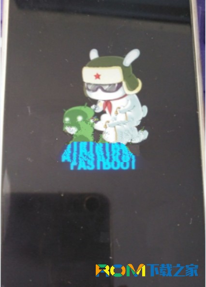 1:手機要進入FastBoot模式,進入的方法:在手機關機狀態下,按住音量鍵-和電源鍵,當屏幕中出現一只米兔正在修安卓機器人則已經進入FastBoot模式,如下圖所示。