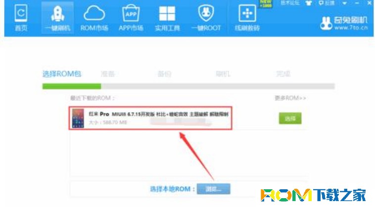 將紅米Pro通過USB數據線與電腦進行連接,運行“奇兔刷機”工具,待紅米Pro被成功識別後,切換到“一鍵刷機”選項卡,點擊“浏覽”按鈕以選擇本地刷機包。