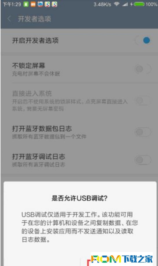 刷機ROM下載完畢之後,就可以通過刷機操作MIUI開發版刷入紅米Pro手機中,那麼用戶可以借助“奇兔刷機”工具來實現,打開紅米Pro手機USB調試開關:依次進入“設置”-“關於手機”界面,連續點擊“Android版本號”即可開啟“開發者選項”界面,並在此界面中開啟“USB調試”開關。