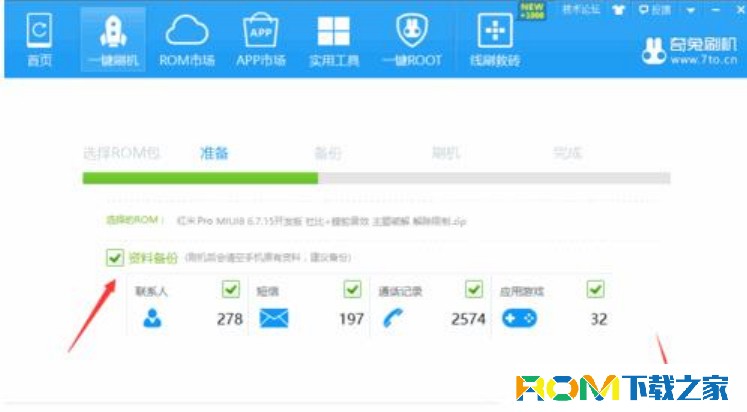 首先是驗證,驗證通過之後,便進入正式刷機過程,如圖所示,在此需要對手機重要數據資料進行備份操作,勾選想要備份的手機數據 ,點擊“開始刷機”操作。