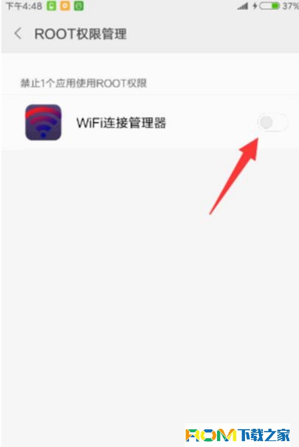 接著在“授權管理”界面中,點擊“ROOT權限管理”項,並在其授權界面中,開啟想要申請ROOT權限的應用,即可允許指定應用使用紅米Pro手機ROOT權限。