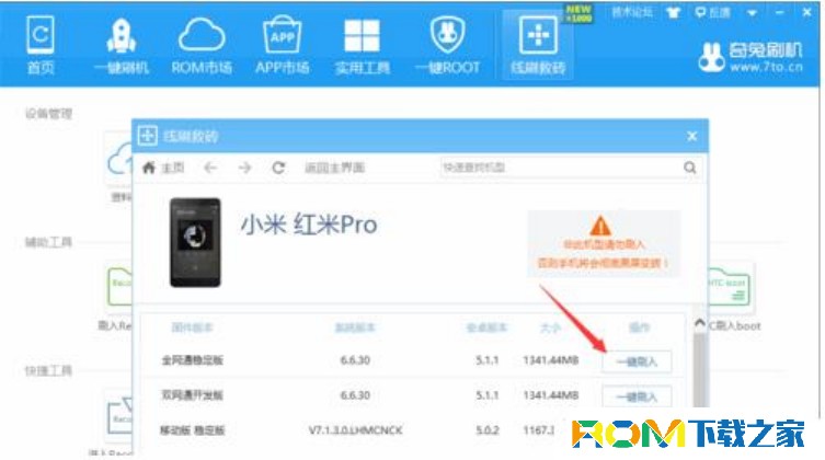切換到“線刷救磚”選項卡,找到“紅米Pro”對應的線刷包,並在其詳情界面中點擊“一鍵刷入”按鈕,以便對紅米Pro進行修復救磚操作。