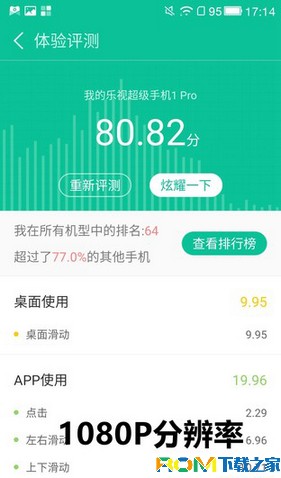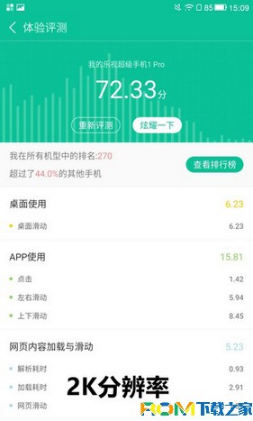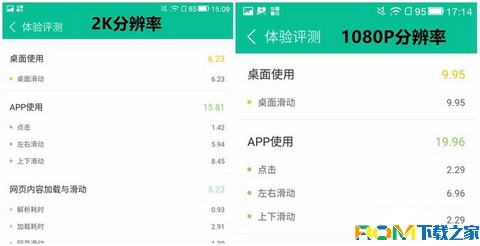經過對比可以看出原本分辨率為2K的手機在降低至1080P後,不論是桌面使用得分,還是APP得分以及網頁加載與滑動等都有不同程度的提升,總分也從原來的72分變為80分,實際體驗也確實如此。