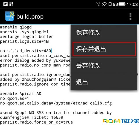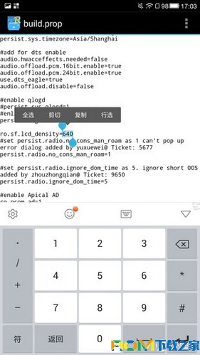 最後使用RE文件管理器,編輯build.prop。將“ro.sif.lcd_density=”的參數改寫成為需要修改的數值,保存即可,同理1080p想要修改成為720p,所需要修改的density數值=原density數值/(1080/720)=320。
