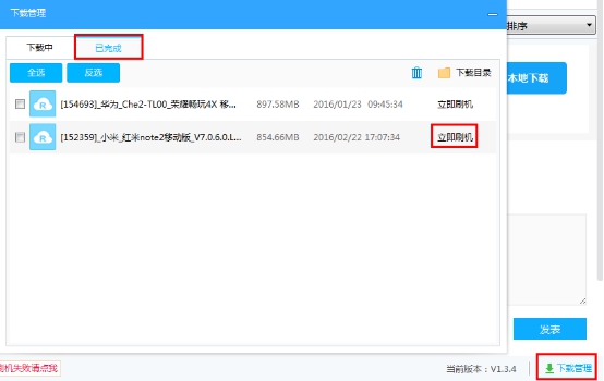 PS:如沒有收到提示,可點擊客戶端右下角藍色“下載管理”,在彈出的下載管理窗口中,選擇“已完成”,找到下載的刷機包,點擊“立即刷機”。