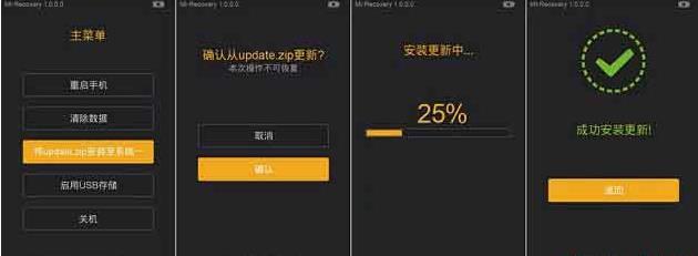 第三步:然後選擇“簡體中文”並確認(音量鍵選擇電源鍵確認),選擇“將update.zip安裝至系統一”並確認。選擇確認後等待完成,選擇重啟至系統一即可,如下圖所示: