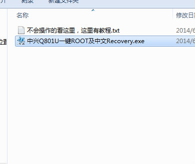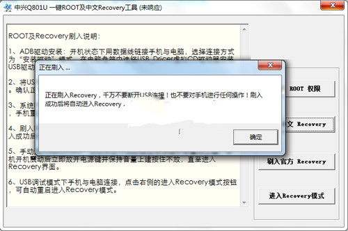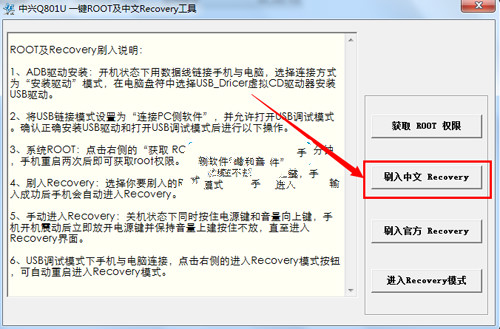 4:接著在解壓出來的文件夾裡找到【中興Q801U一鍵ROOT及中文Recovery.exe】文件,然後直接雙擊打開運行就可以了,然後在界面上直接點擊【刷入中文 Recovery】的按鈕,然後軟件就會自動刷入recovery了。