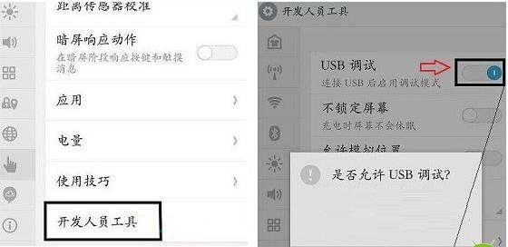 1. 在魅族Pro 5的主屏幕上找到“設置”圖標並點擊進入,然後在左側列表中找到手型圖標“輔助設置”,接下來在下方將會看到“開發人員工具”選項,點擊進入後將“USB調試”後面的開關打開即可。此處會然出提示窗口,詢問 “是否允許USB調試”,點“確定”,如下圖所示: