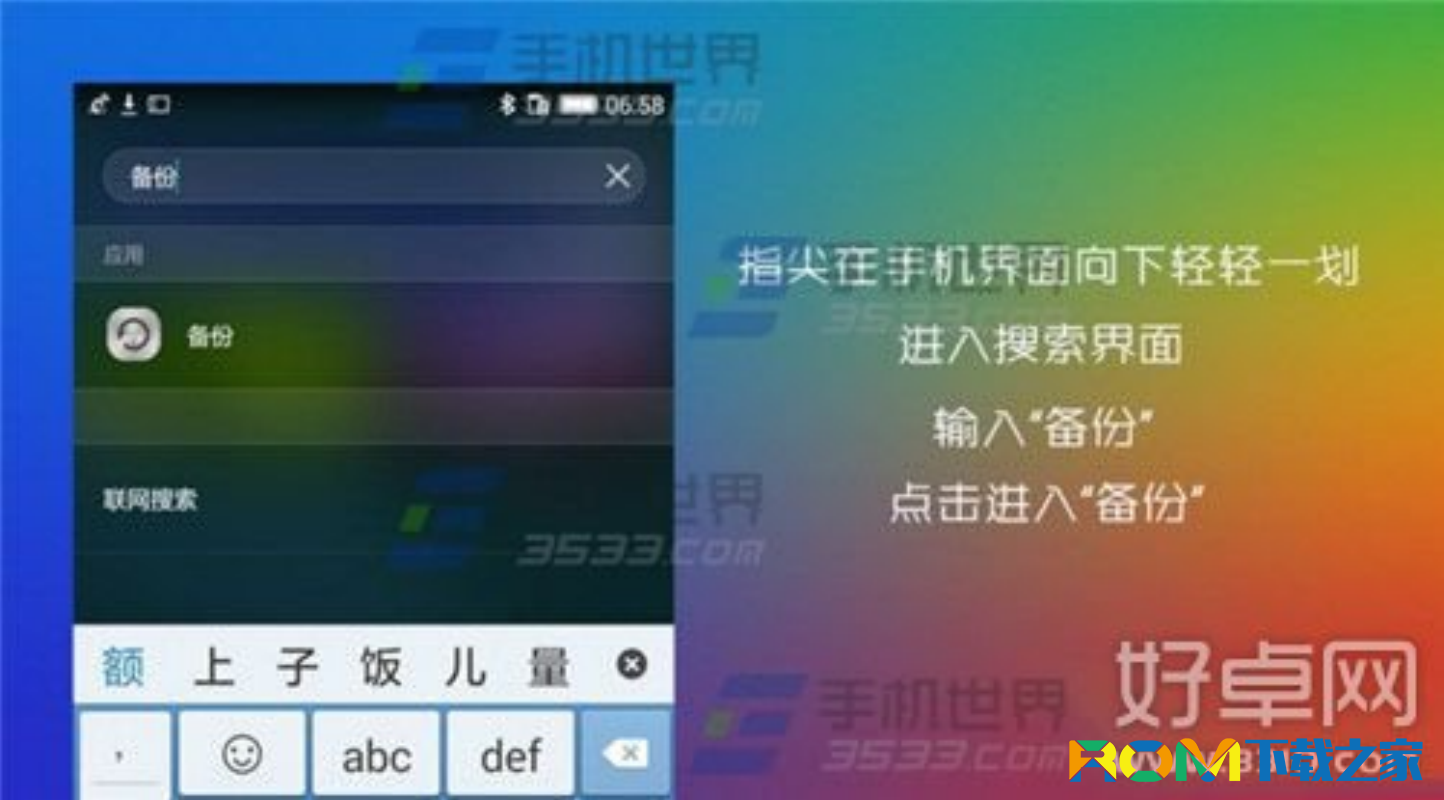 1、在華為榮耀7等機界面中下劃進入【搜索界面】,輸入【備份】,點擊並打開搜索結果裡的備份。(如下圖)