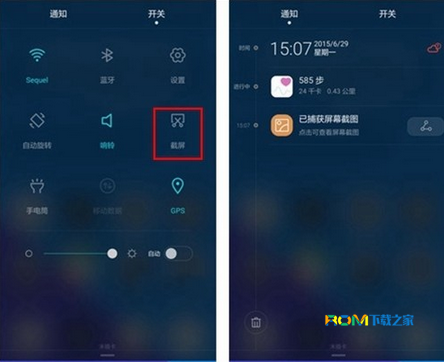 由於榮耀7運行的是EMUI 3.1系統,所以還有一種截屏方法就是下拉菜單進行截圖,這和榮耀6以及榮耀6 Plus的截圖方法是一樣的,用手指將屏幕向下滑動一下看到【截屏】字樣點擊一下便可截圖,如下圖所示。