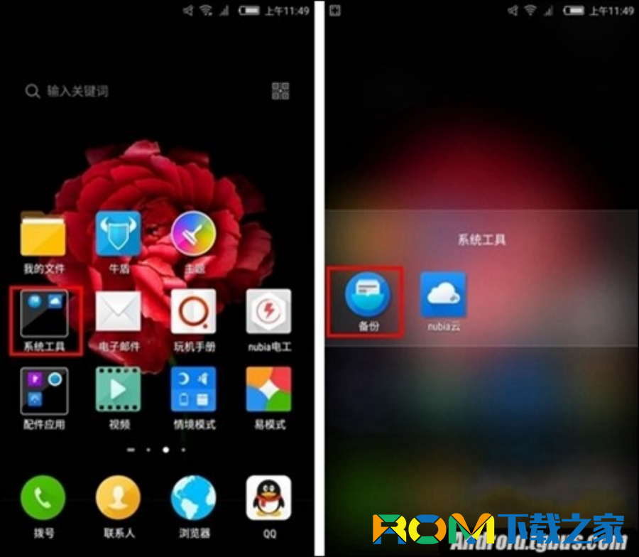 1、首先進入到努比亞Z9 mini系統桌面,找到【系統工具】--【備份】點擊進入,如下圖所示: