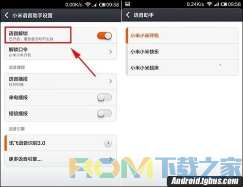 2、在“小米語音助手設置”中,我們可以看到“語音解鎖”點擊一下,然後就可以設置解鎖口令(共有三個口令供選擇“小米小米開機”、“小米小米快樂”、“小米小米起床”),現在還不能自定義解鎖口令,只能使用已經定義好的,還稍微有點費電。手機鎖屏後,對著說:“小米小米起床”,手機就亮了,不過還是要輸入解鎖密碼的,大家快去試試吧。