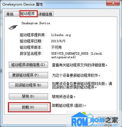 3、雙擊點擊Onekeyrom Device,進入“驅動程序”項點擊“卸載”