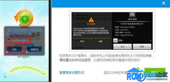 當手機需要允許root授權時,刷機助手會有相應提示,此時點擊允許即可。建議在選擇允許時勾選“記住這次選擇”,避免再次選擇的麻煩。