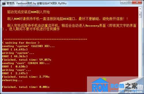 6、記者你會看到紅色背景的程序界面,稍後手機會自動重啟,自動進入fastboot模式並進行刷機,如果長時間沒有反映,可以嘗試重新連接數據線並重新運行線刷程序,正常刷入過程如下圖所示;