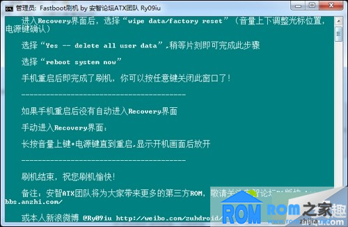 7、所有文件刷入成功後,手機會自動重啟開機,此時不要對手機進行任何操作,等待片刻後手機會再一次自動重啟,此時會進入Recovery模式(即全是英文文字的界面),然後請根據線刷程序上給出的提示信息進行操作即可;