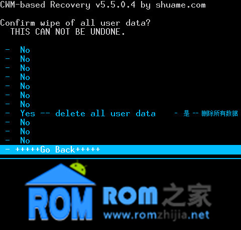 第三行:wipe data/factory reset - 清除數據、恢復出廠設置