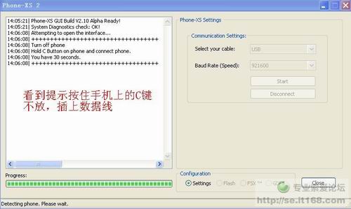 點“開始”後你有30秒的時間按住手機上的C鍵插入數據線連接電腦,等待讀取出手機信息後放手即可。