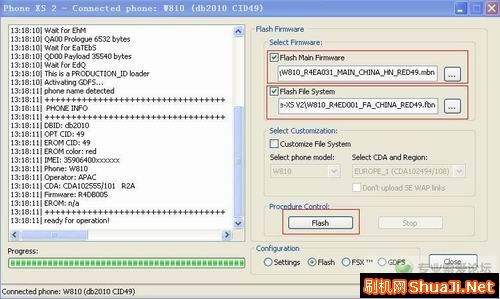 等讀出手機信息後,選擇我們要刷的固件。固件一共有2個部分,main和fs,這一點相信弄糊塗了不少人,這個在固件下載裡面都有下載的,請放心。