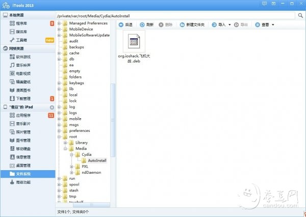 3.設備連接電腦,打開91、Tools等第三方管理工具(小編用iTools做演示)找到我的設備-》文件系統-》越獄系統-》找到路徑“/private/var/root/media/cydia/autoinstall/”,或者直接點擊常用目錄下的Cydia安裝目錄,將要安裝的DEB文件導入。