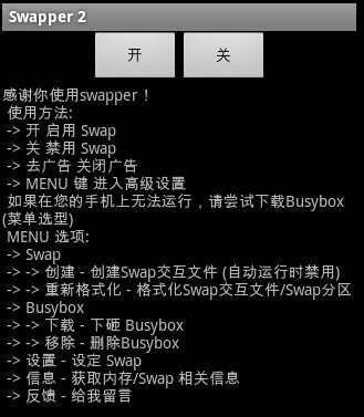 這個軟件很容易用,下下來打開,然後在軟件裡先按 菜單-設置-swap大小-推薦選64MB,夠用了,如果你是後台狂人也可以選擇更大點的【當然我覺得96MB和128MB也可以,請酌情選擇,我開的是 64MB,因為我用機強度不大。。。】然後選 swapniess大小,推薦選60,這個數值越大系統越會積極用分區…