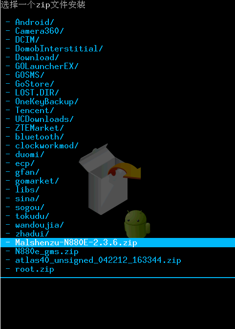6確認後查找sd卡中的zip包,使用音量上下鍵選擇,直到找到zip包為止