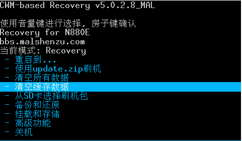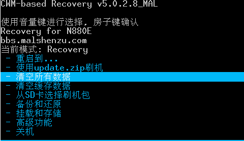 其中N880E的recovery進入方式:先按音量向上鍵不松手,再按電源鍵不松手,兩鍵一起按,持續10秒鐘,