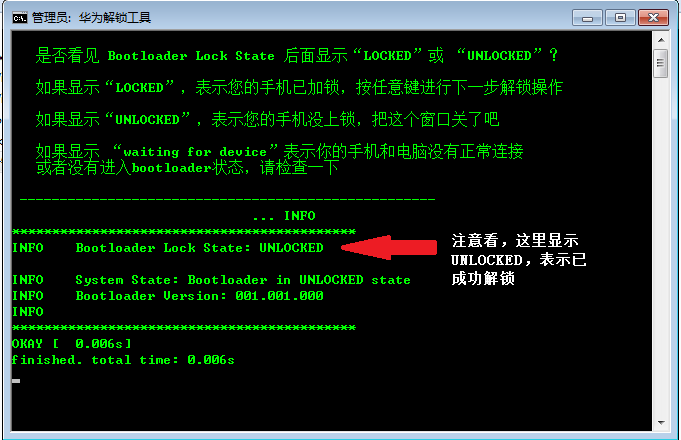 備注:在解鎖成功後,用戶如果希望將手機重新加鎖,以使用google的Widevine功能,則需要進行如下操作:首先,通過SD卡升級方式,將手機版本重新恢復為華為官方發布版本;然後,進入fastboot模式,敲入命令fastboot oem lock ****************。手機將自動重啟,然後將手機設置為“RELOCKED”狀態。這樣,就可以正常使用google Widevine功能了。