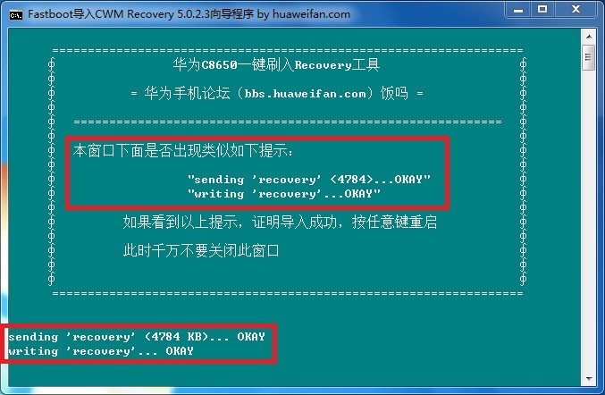 5、繼續按任意鍵就會開始刷入Recovery工具,如是出現下圖片顯示已經刷入成功了。