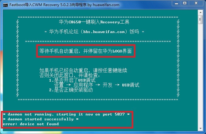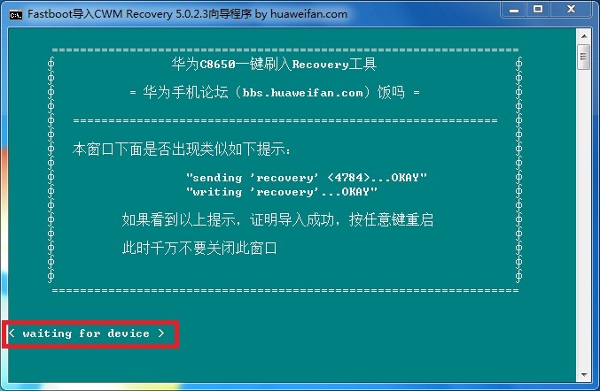 一般前面提示驅動沒安裝好這步就會出現< waiting for device >的提示的,如下圖片所示: