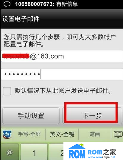 3.然後回到手機裡來, 選擇電子郵件,打開然後輸入用戶名跟密碼,然後選擇下一步