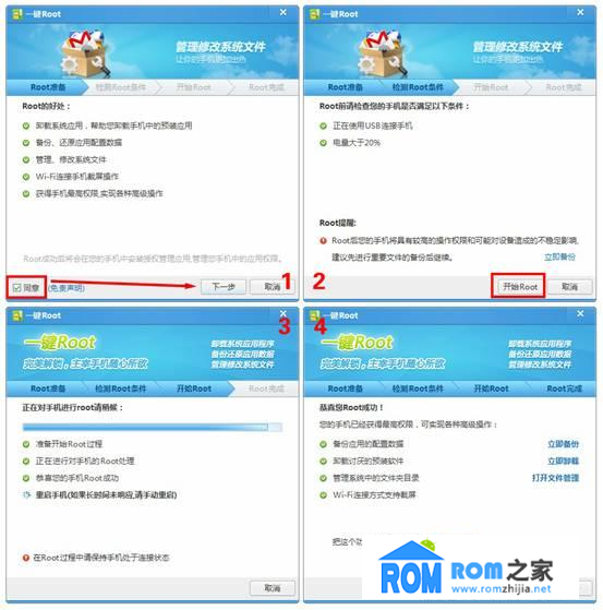 騰訊手機管家PC版一鍵ROOT功能分四個步驟(圖2),分別是ROOT准備、檢測Root條件、開始Root和Root完成。如果第三步成了,那一鍵ROOT就成功了,如果失敗,還能保持手機不掛掉(某些一鍵Root工具可能導致手機變磚)!