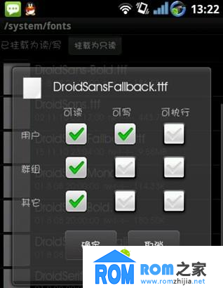 第五步:覆蓋完畢後,長按DroidsansFallback.ttf選擇權限,三個讀取豎列全部打勾,然後再把寫入的第一個也打勾,重啟手機看效果。英文字體的替換同上